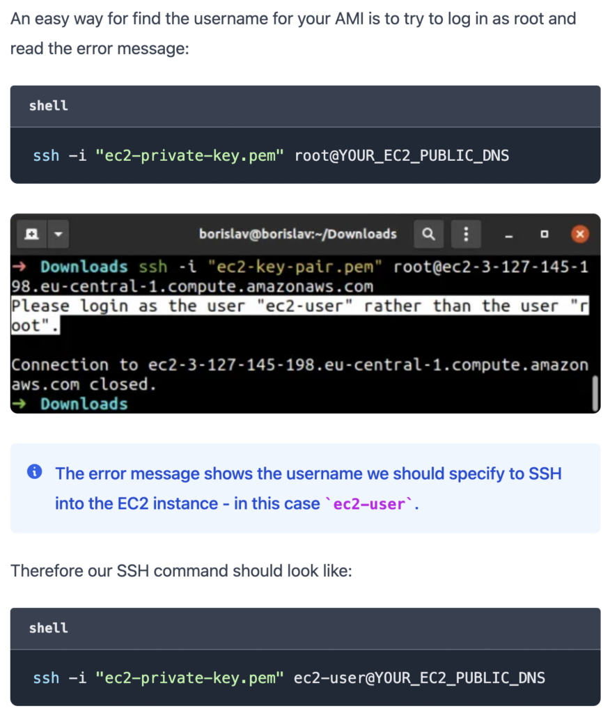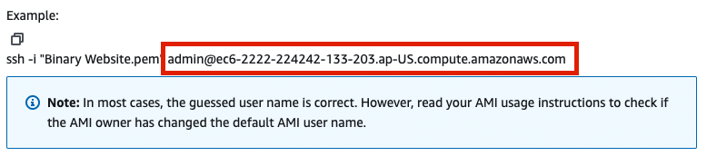 - The username in the ssh connection URL is incorrect. The username is different for the different Amazon Machine Images.