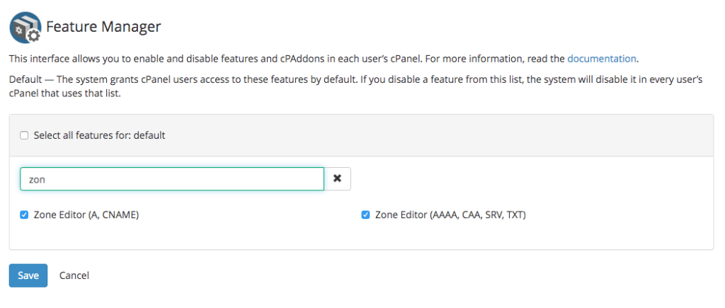 - Scroll to the bottom and click on the Save button. This saves your configuration and all accounts that use that configuration will have/ not have the Advanced DNS Zone Editor according to your configuration.